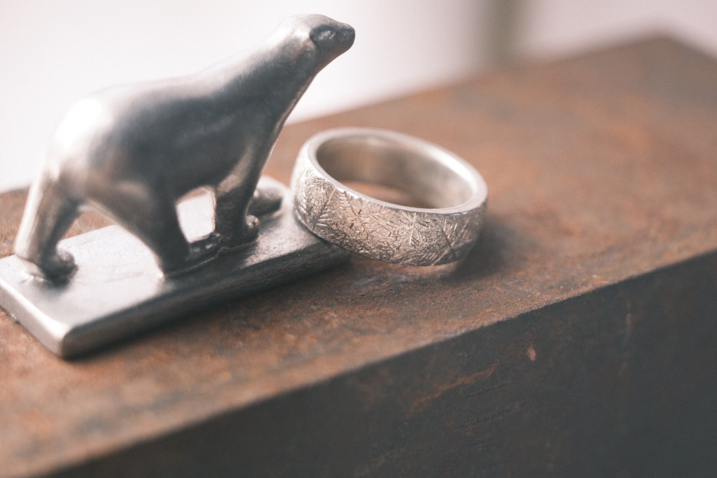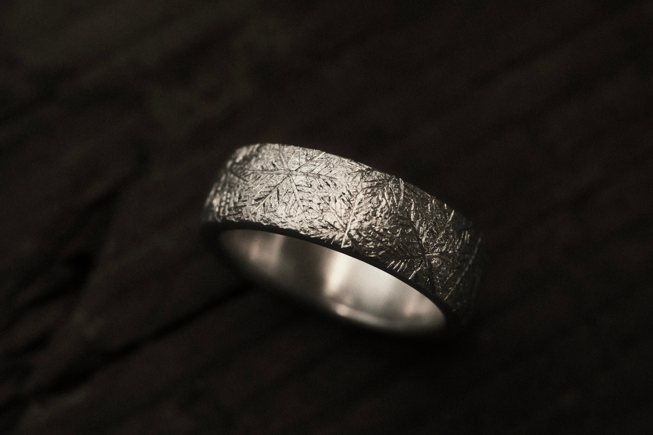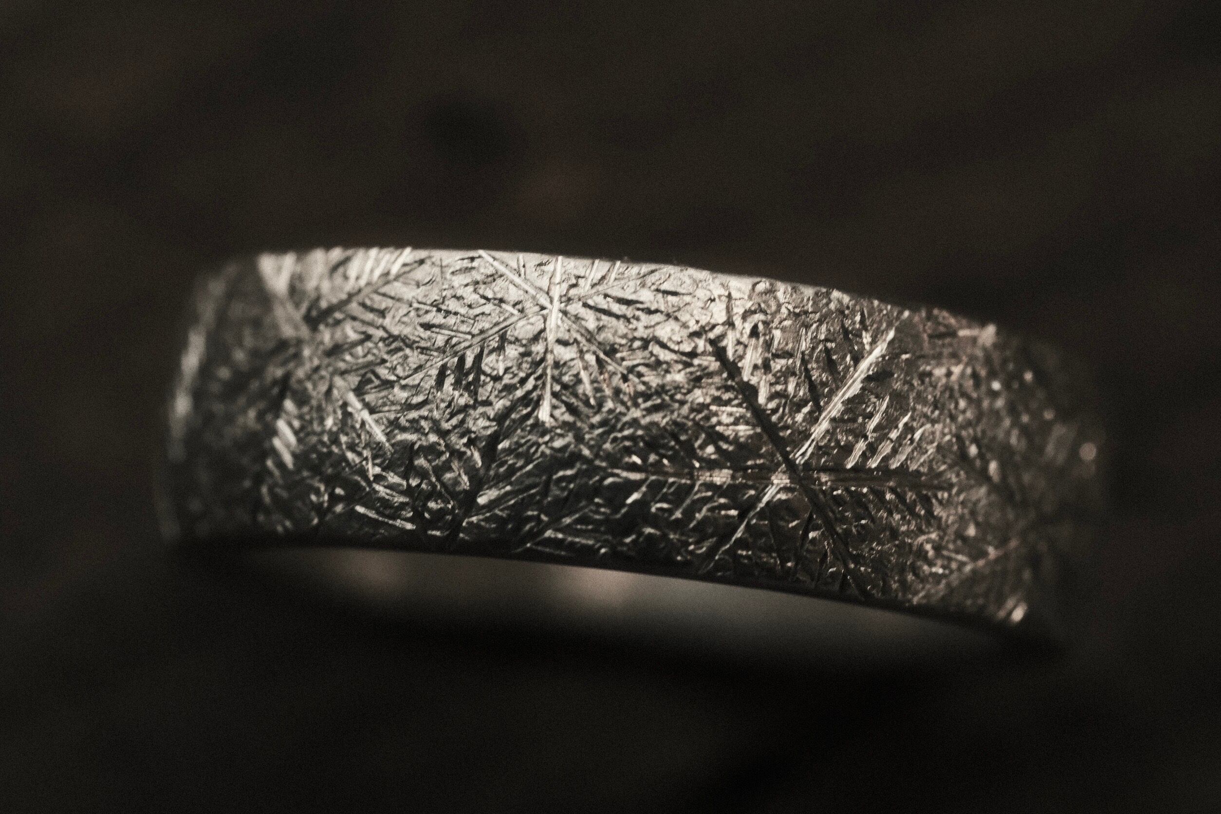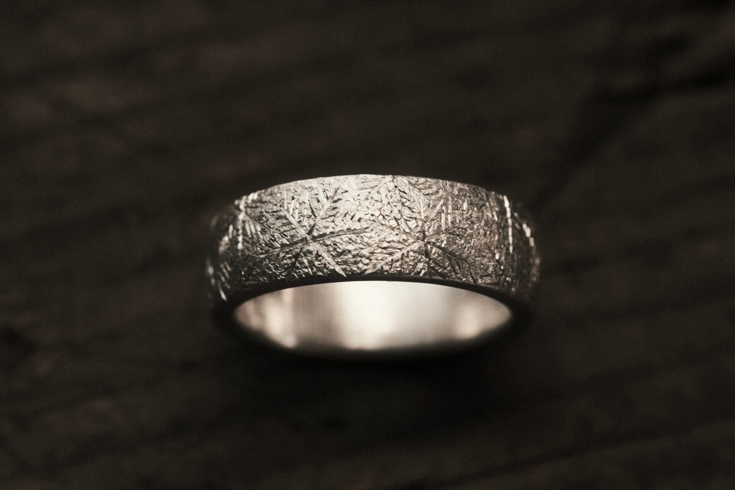 表面に細かな結晶やテクスチャーを彫ることで霜に覆われた様なデザインに仕上げました。凛とした佇まいが指元を静かに飾ります。