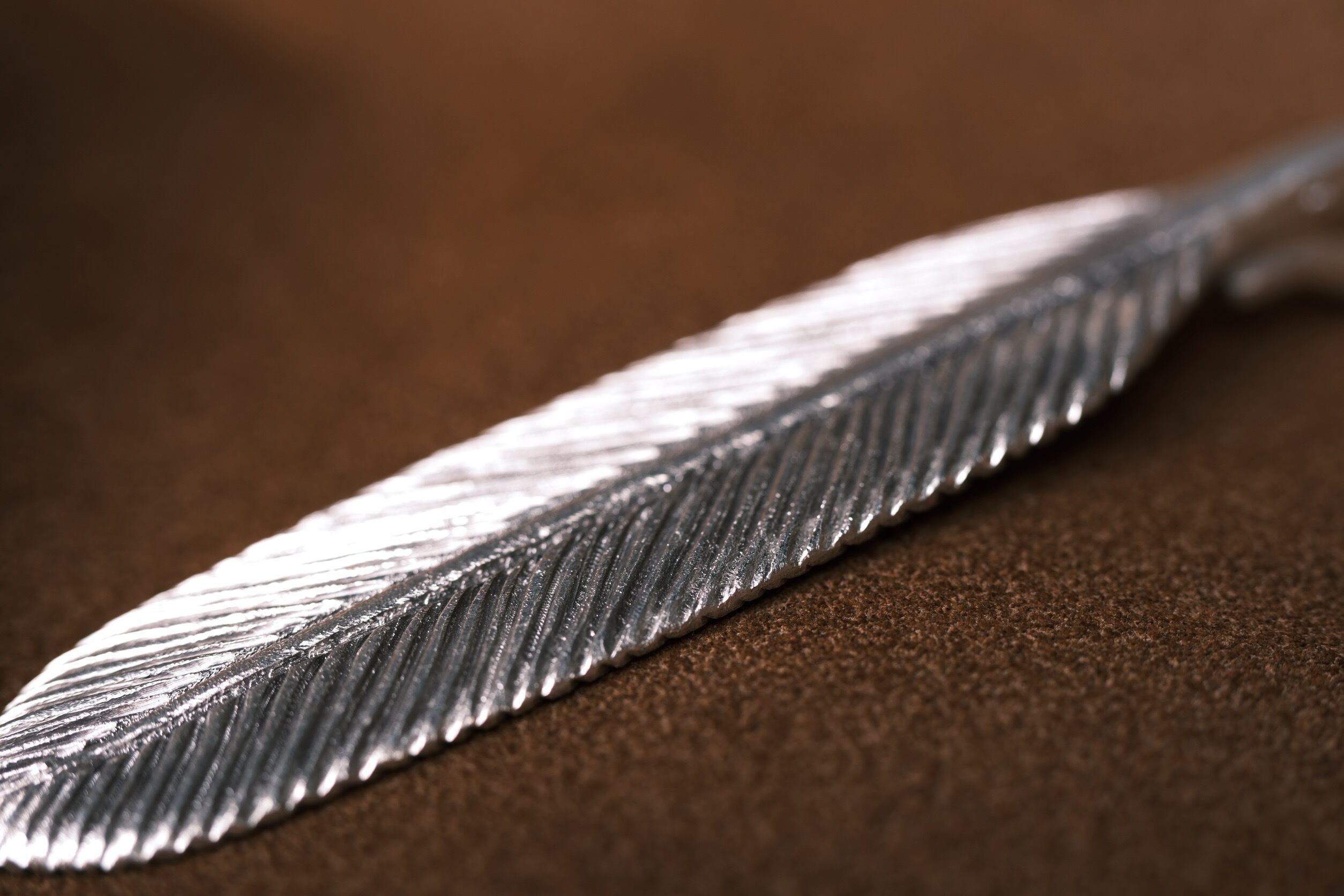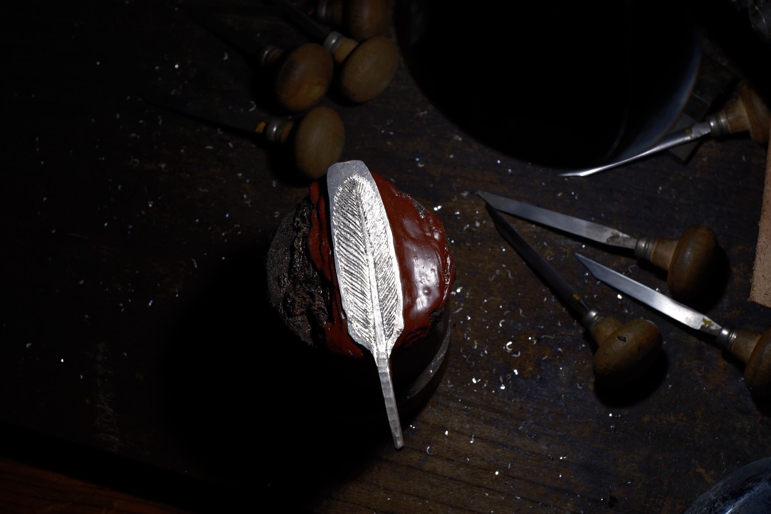 鍛造した地金から羽根の形を切削。洋彫りによって重厚で無骨ながら繊細な彫りが施されています。